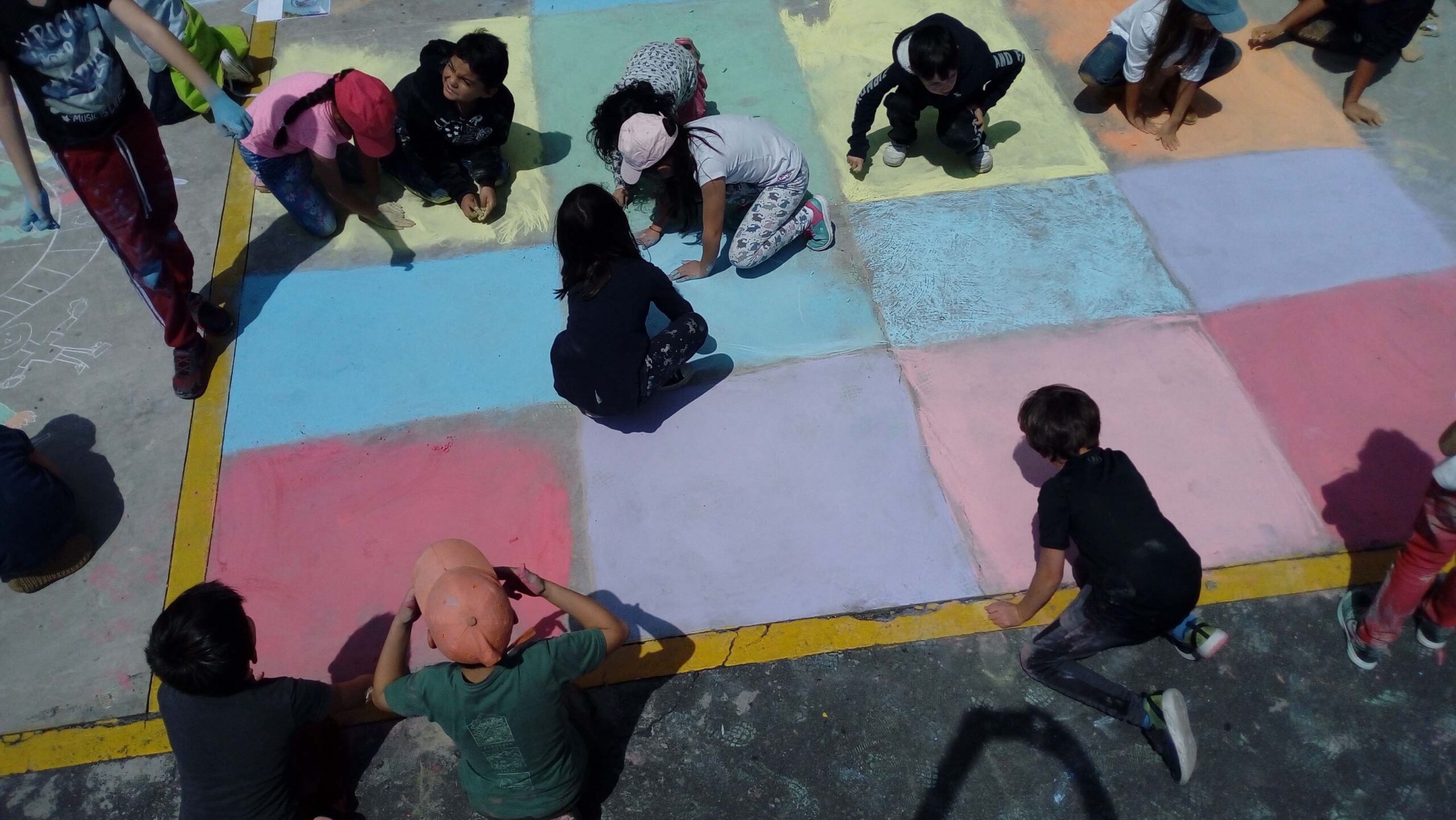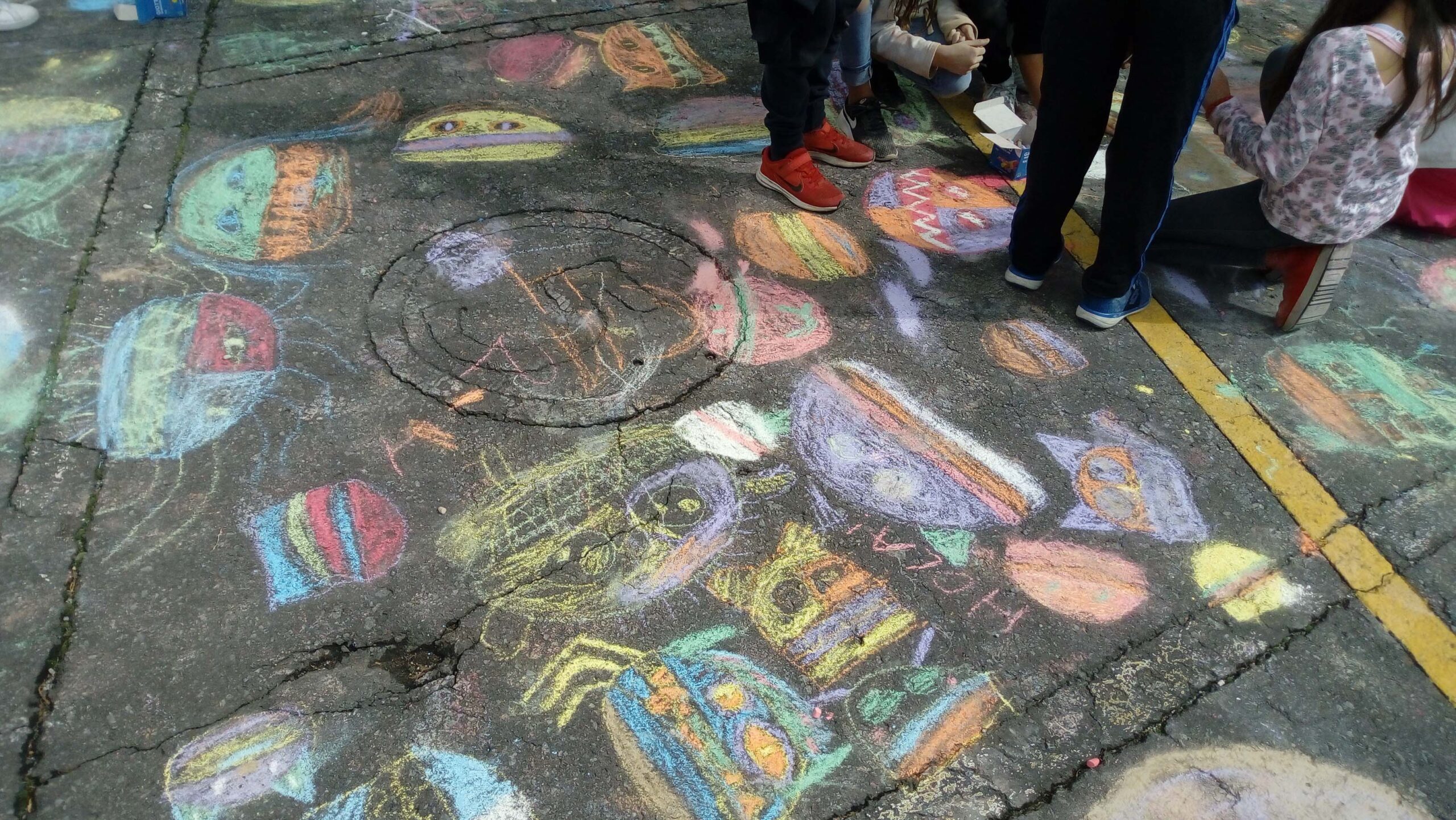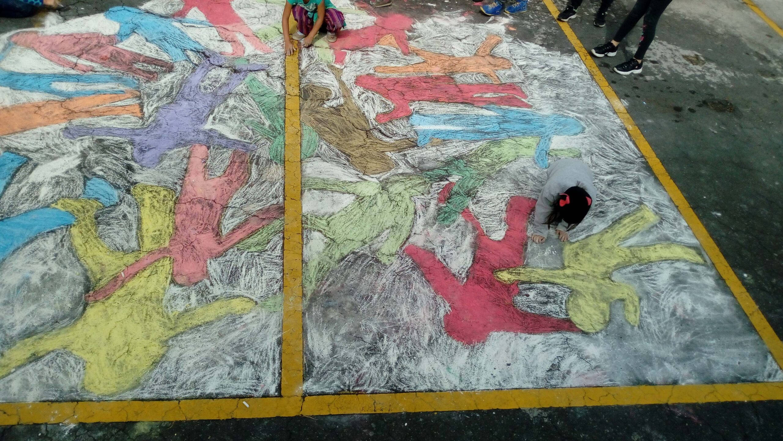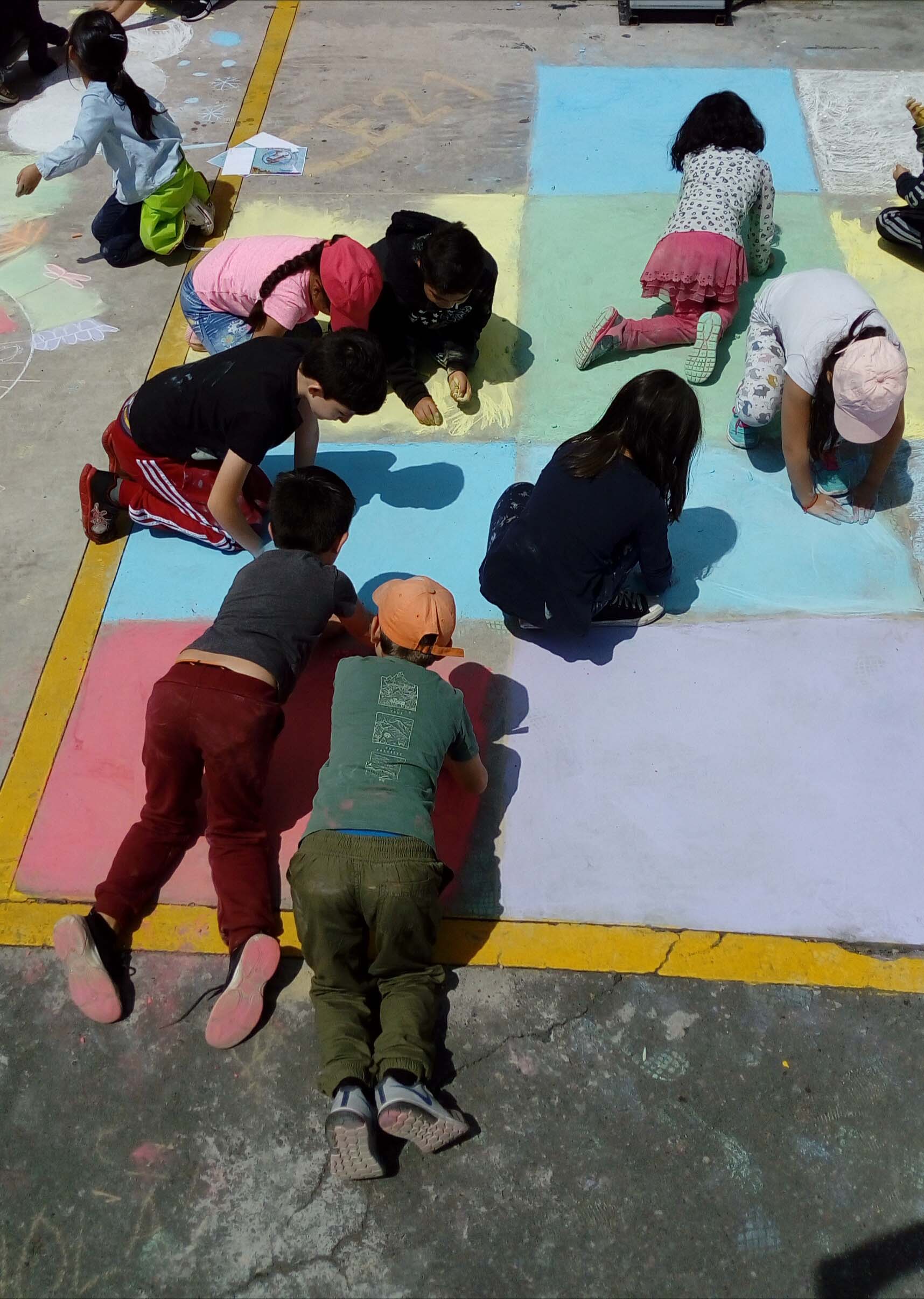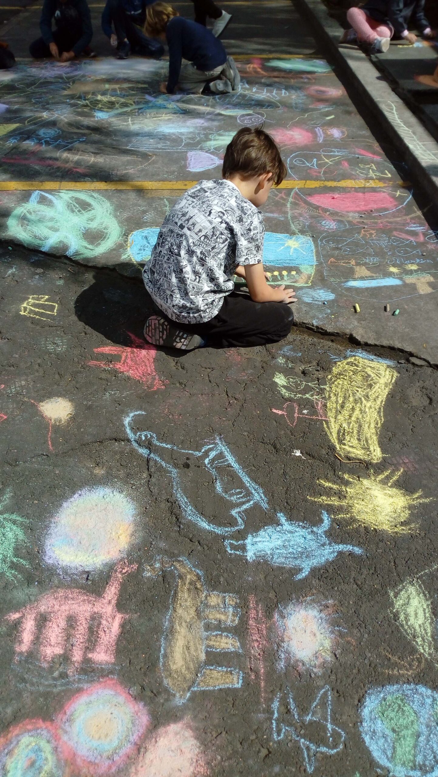Sujet pour le primaire, tous niveaux. Ce projet d’établissement destiné aux classes de primaire a été initié par Luigi Brusa, référent culturel, inspiré par certaines villes colombiennes où, pour la fin de l’année civile, les habitants couvrent les rues d’immenses dessins à la craie. J’ai seulement participé à l’organisation mais c’est une idée qui mérite le détour.